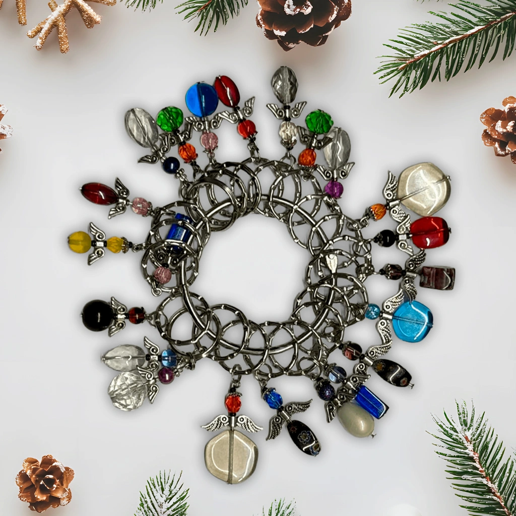 Minden „Zsákba Angyalka” egyedi: kézzel fűzött üveg- és féldrágakő/ásvány gyöngyökből, ezüstszínű fém alkatrészekkel, kis szárnyacskákkal.