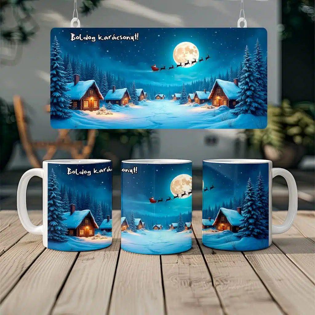 Mesebeli Téli Táj A bögre palástján egy gyönyörűen kidolgozott, részletgazdag téli jelenet elevenedik meg. A mélykék éjszakai égbolton ragyogó telihold világítja meg a hófödte fenyőfákat és a barátságos, kivilágított ablakú kis házikókat. A kép fókuszpontjában a Mikulás és rénszarvasai repülnek át az égen, hirdetve az ünnep örömét. A dizájnt a klasszikus, kézírásos stílusú „Boldog karácsonyt!” felirat koronázza meg.