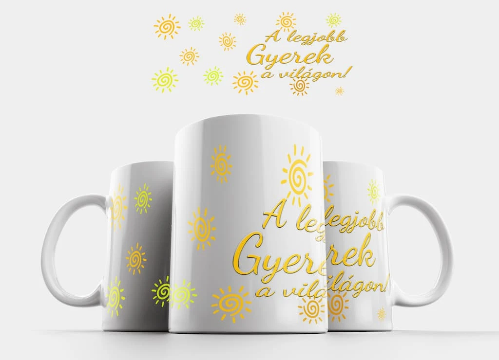 Lepd meg gyermeked ezzel a vidám napocskás bögrével, amelyen a “Legjobb gyerek a világon” felirat látható. A bögre mosogatógépben is mosható, így a mindennapi használat során sem kell aggódnod a minta kopása miatt. Tökéletes reggeli kávézáshoz vagy teázáshoz, és garantáltan mosolyt csal az arcára!