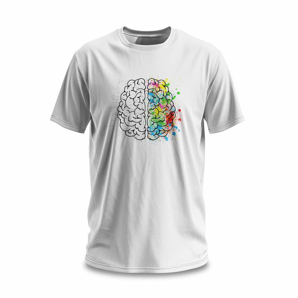 Ez a póló a bal és jobb agyfélteke harmóniáját hozza el neked! Az előlapon egy színes, kreatív grafika látható, amely a művészi és analitikus gondolkodás tökéletes egyensúlyát szimbolizálja. 100% pamut anyaga kényelmes viseletet biztosít, így akár egész nap hordhatod, legyen szó munkáról vagy szabadidőről.